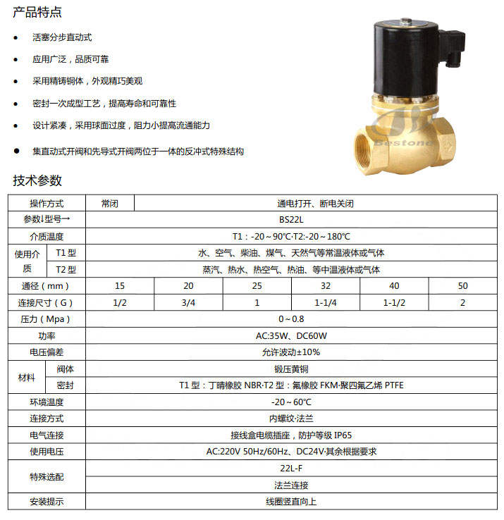 BS22L-DN15,BS22L-DN20,BS22L-DN25,BS22L-DN32,BS22L-DN40,BS22L-DN50,活塞分步直動(dòng)式黃銅電磁閥