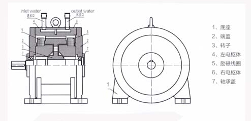 左右電樞體(帶有渦流環(huán))中設(shè)置有相同的冷卻水路,勵磁線圈裝在兩個電樞體之前,冷卻水從進水口進入后經(jīng)電樞體下半部進入渦流環(huán)冷卻水槽中,然扣從電樞體的上半部流進出水口,通過出水口流出。