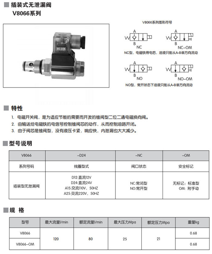 V8066-D12,V8066-D24,V8066-A15,V8066-A25,V8066-D12-NO-OM,V8066-A25-NC,插裝式無泄漏閥