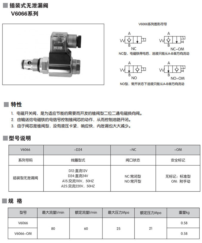 V6066-D12,V6066-D24,V6066-A15,V6066-A25,V6066-D12-NO-OM,V6066-A25-NC,插裝式無泄漏閥