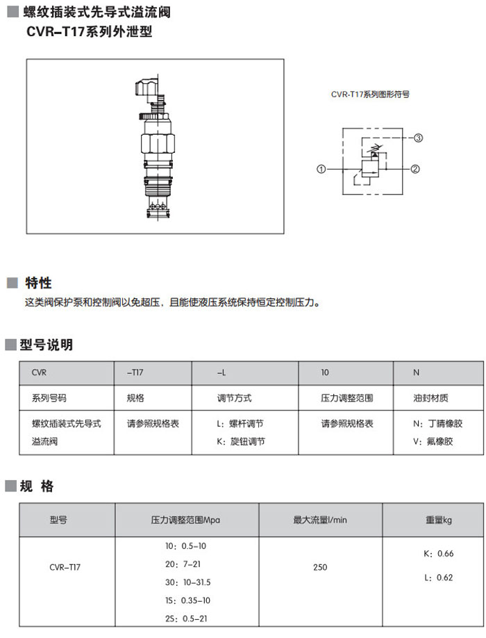 CVR-T17-L10N,CVR-T17-K10N,CVR-T17-L20N,CVR-T17-L30N,CVR-T17-L1SN,CVR-T17-L2SN,螺紋插裝式先導(dǎo)式溢流閥