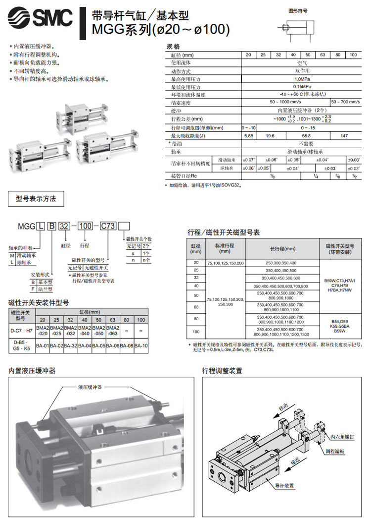 MGGLF20,MGGLF25,MGGLF32,MGGLF40,MGGLF50,MGGLF63,MGGLF80,MGGLF100,MGGLF20-75,SMC帶導桿氣缸