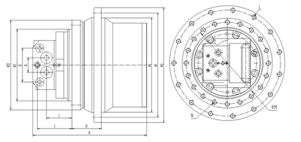 本產(chǎn)品為馬達(dá)與減速機(jī)一體的行走裝置。由集成于減速機(jī)內(nèi)部的雙排量軸向柱塞馬達(dá)、行走減速器組成。馬達(dá)內(nèi)置安全閥、防反轉(zhuǎn)閥、停車制動裝置及高低二檔轉(zhuǎn)換裝置,它的特點是:傳動比范圍大、結(jié)構(gòu)緊湊、工作效率高、可靠性強(qiáng)、體積小、運(yùn)動平穩(wěn)、噪音低等,同時具有多級安全保護(hù)、使用壽命長等優(yōu)點。適用于液壓履帶驅(qū)動行走裝置