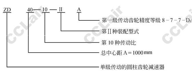 在減速器的代號(hào)中,包括減速器的型號(hào),總中心距,傳動(dòng)比,裝配型式及齒輪精度等級(jí).