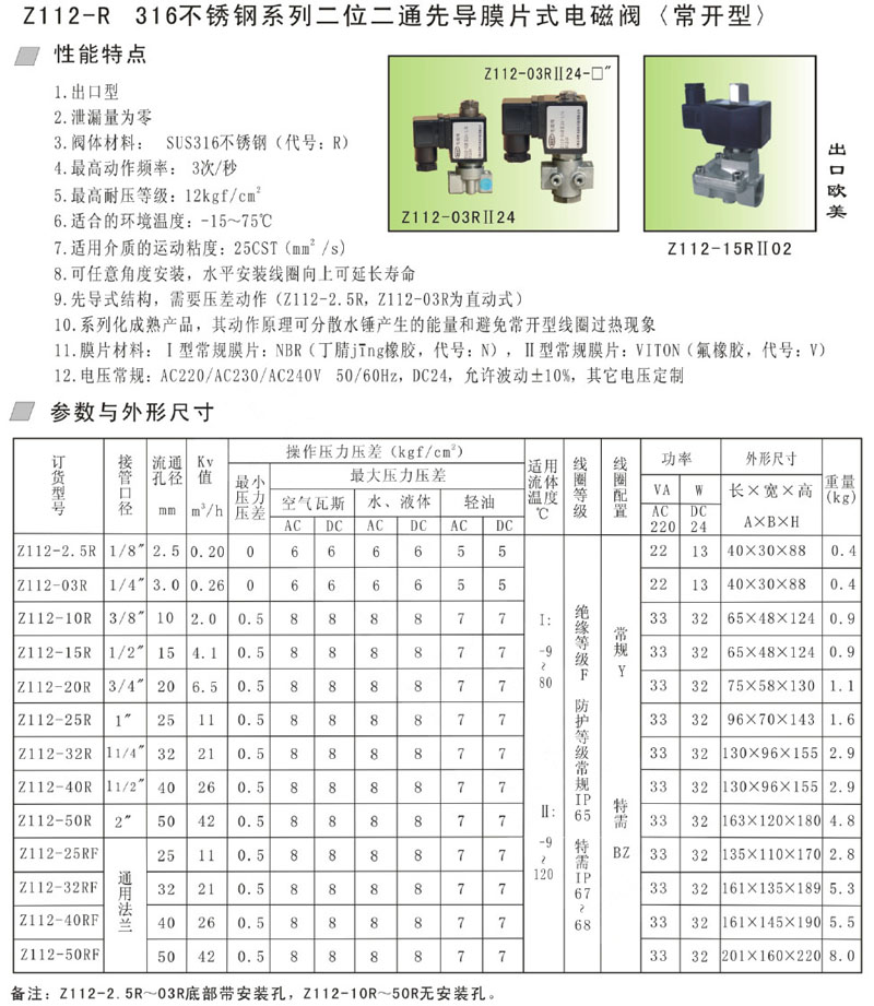 Z112-2.5R,Z112-03R,Z112-05R,Z112-06R,Z112-25RF,Z112-32RF,不銹鋼先導(dǎo)膜片式電磁閥