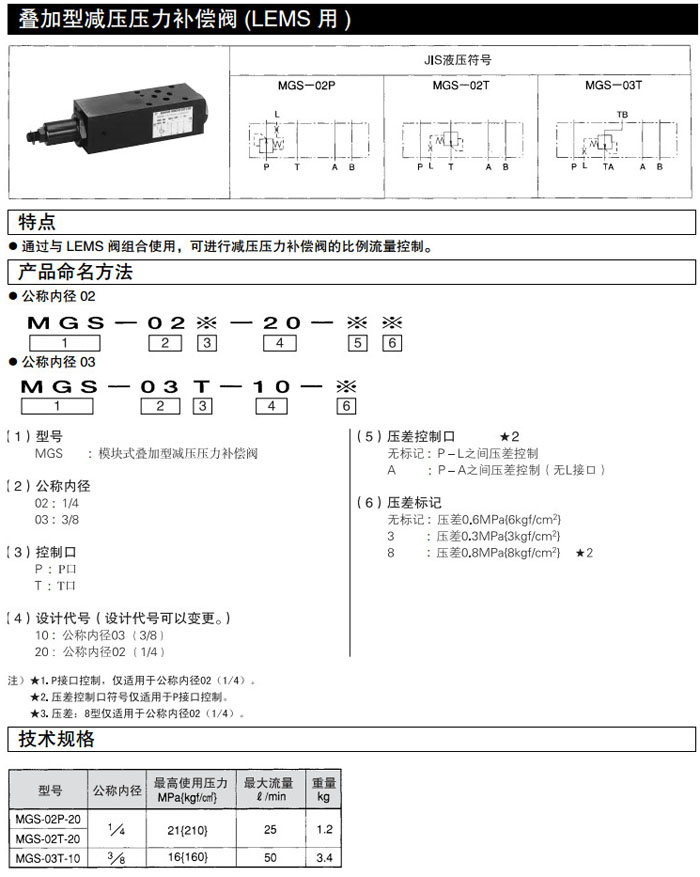 MGS-02P-20,MGS-03T-10,MGS-02T-20,MGS-03P-20,MGS-03T-20,DAIKIN疊加型減壓壓力補償閥