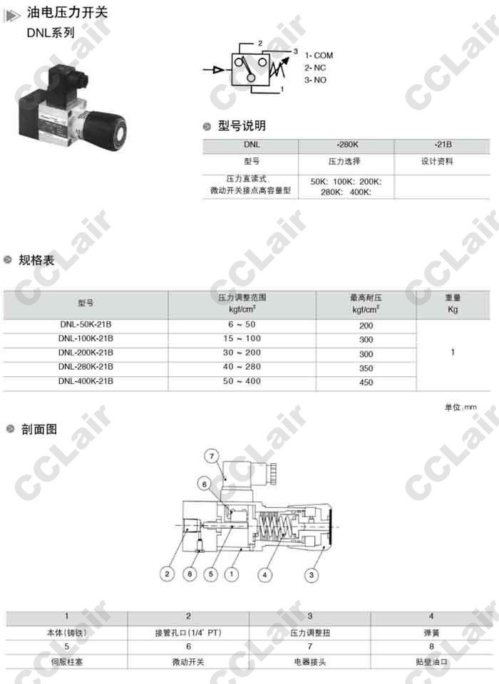 詳細(xì)信息 DNL-50K-21B,DNL-100K-21B,DNL-200K-21B,DNL-280K-21B,DNL-400K-21B,油電壓力開關(guān),無錫昌林