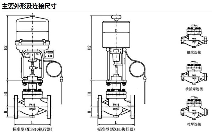 自力式電控溫度調(diào)節(jié)閥由控制閥門、電動執(zhí)行機構(gòu)、溫度傳感器和溫度調(diào)節(jié)器等部件組成,根據(jù)用戶需要,分別有加熱型與冷卻型兩種結(jié)構(gòu)。加熱型調(diào)節(jié)閥的結(jié)構(gòu)與原理:工作前主閥芯處于半開位置,傳感器處于自然狀態(tài)。接上電源,主閥芯全開。介質(zhì)由箭頭方向流入主閥體、經(jīng)閥芯對儲熱箱進行加熱。當(dāng)溫度升到相應(yīng)設(shè)定值時,傳感器即產(chǎn)生相應(yīng)線性信號輸入一體化執(zhí)行機構(gòu),隨即驅(qū)動閥桿、閥芯產(chǎn)生位移,關(guān)閉主閥芯停止加熱。當(dāng)溫度低于設(shè)定值時,傳感器即產(chǎn)生線性信號輸入一體化執(zhí)行機構(gòu),驅(qū)使閥芯漸開,使介質(zhì)按拋物線特性流入儲熱箱,進行加熱直至設(shè)定值。這樣被控介質(zhì)始終在設(shè)定溫度范圍內(nèi)被控制,從而達到控溫目的。備注:常說的加熱型、冷卻型。在此閥中只要更換閥芯結(jié)構(gòu)即可以實現(xiàn)。