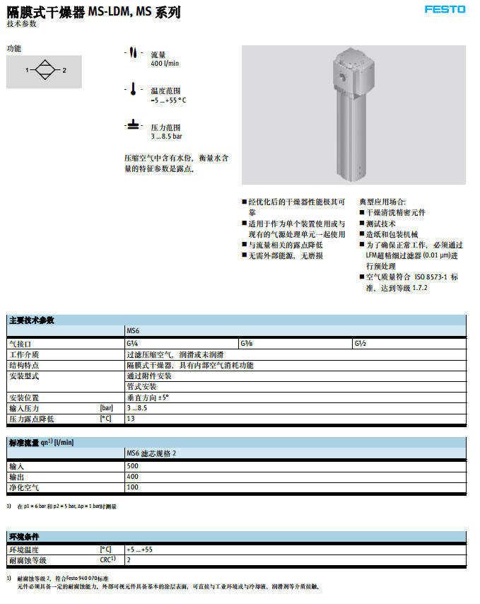 MS6-LDM-1/4-RD-P2-Z,MS6-LDM-3/8-RD-P2-Z,MS6-LDM-1/2-RD-P2-Z,festo隔膜式干燥器