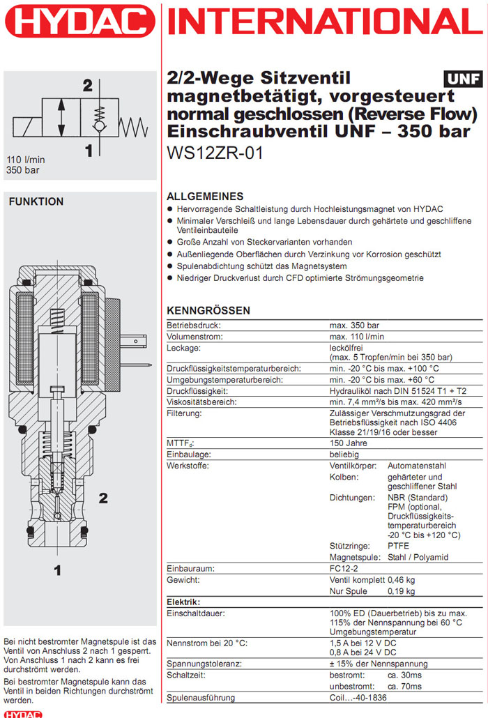 首頁(yè) > 產(chǎn)品&解決方案 > WS12ZR-01-C-N-24DG,WS12ZR-01-C-N-230AG,HYDAC電磁2/2方向座閥