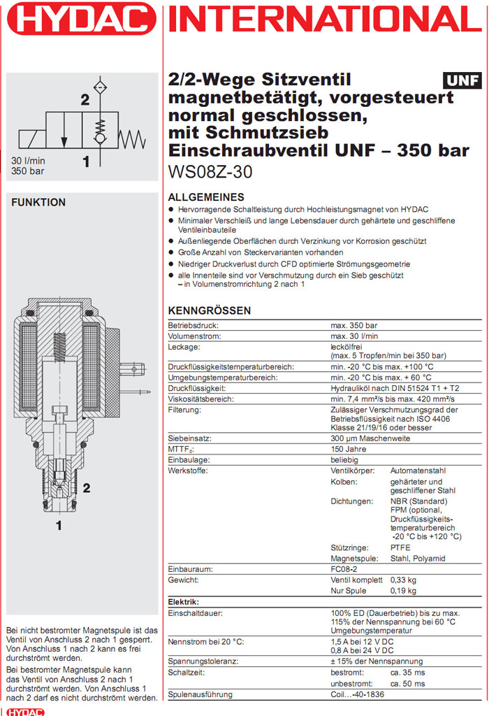 首頁 > 產(chǎn)品&解決方案 > WS08Z-30-C-N-24DG,WS08Z-30-C-N-230AG,HYDAC電磁2/2方向座閥