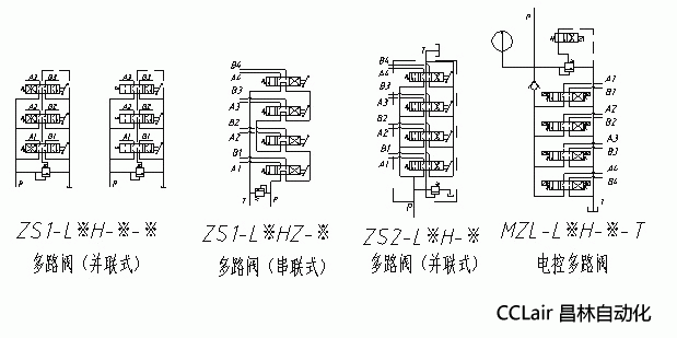 例:ZS1-L10H-4T-40,表示:4片閥都是彈簧復(fù)位和“O”型機(jī)能。