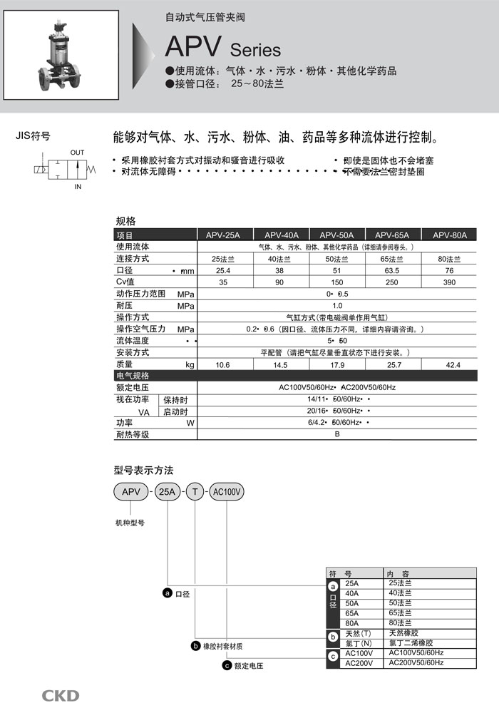 詳細信息 APV-25V-T-AC100,APV-40V-T-AC100,APV-50V-T-AC100,APV-65V-T-AC100,APV-80V-T-AC100,CKD自動式氣壓管夾閥