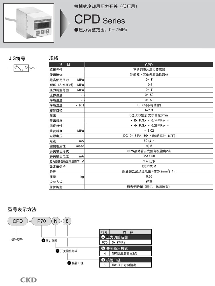 產(chǎn)品: 瀏覽次數(shù):472CPD-P70N-8,CKD壓力開關(guān)