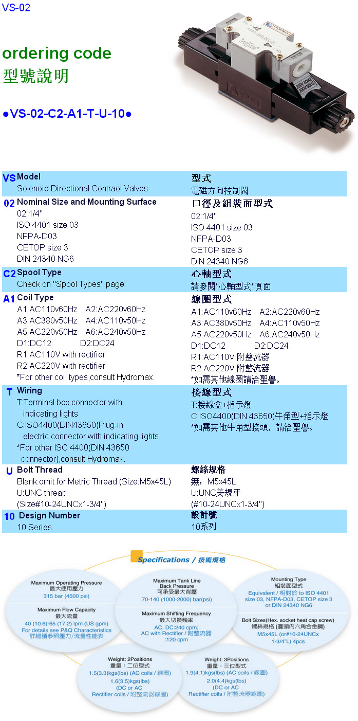 VS-02-C2-A1-T-U-10,VS-02-C2-A2-T-U-10,VS-02-C2-A3-T-U-10,VS-02-C2-A4-T-U-10,HYDROMAX電磁方向控制閥