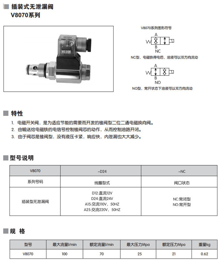 V8070-D24-NC,V8070-D24-NO,V8070-D12-NC,V8070-D12-NO,V8070-A15-NC,V8070-A15-NO,插裝式無泄漏閥 詳細(xì)信息 V8070-D24-NC,V8070-D24-NO,V8070-D12-NC,V8070-D12-NO,V8070-A15-NC,V8070-A15-NO,插裝式無泄漏閥
