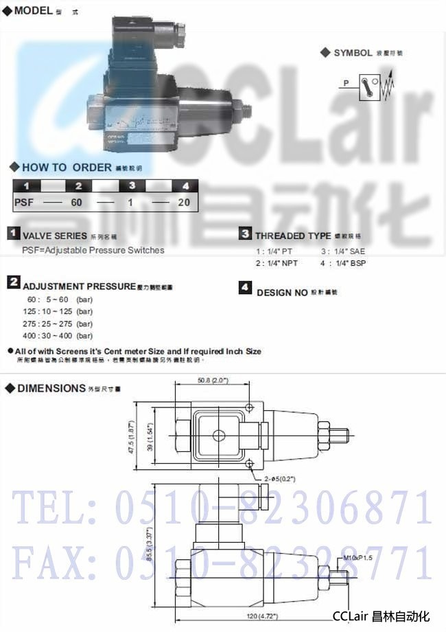 詳細(xì)信息 PSF-60-2-20,PSF-125-2-20,PSF-275-2-20,PSF-400-2-20,調(diào)整式壓力開關(guān),