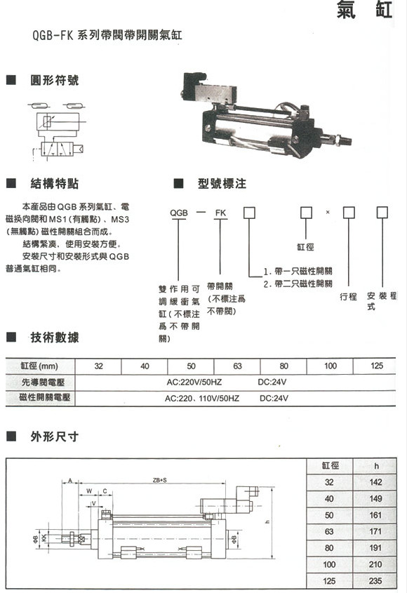 QGB-FK1-32,QGB-FK1-40,QGB-FK1-50,QGB-FK1-63,QGB-FK1-80,帶閥帶開關(guān)氣缸