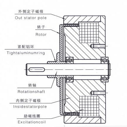 磁滯制動(dòng)器由轉(zhuǎn)子和定子磁極兩大部分組成,轉(zhuǎn)子由特殊的磁滯材質(zhì)制成,內(nèi)、外側(cè)定子磁極之間有一定的間隙,轉(zhuǎn)子在間隙中轉(zhuǎn)動(dòng)。當(dāng)線圈通電時(shí),間隙中產(chǎn)生磁場(chǎng),是轉(zhuǎn)子產(chǎn)生磁滯效應(yīng)。當(dāng)磁滯轉(zhuǎn)子在外力作用下克服磁滯力轉(zhuǎn)動(dòng)時(shí),也可通過減速機(jī)測(cè)試產(chǎn)生額定的扭矩。扭矩僅與激磁電流大小有關(guān),與轉(zhuǎn)速無(wú)關(guān),實(shí)現(xiàn)非接觸的扭矩傳輸。