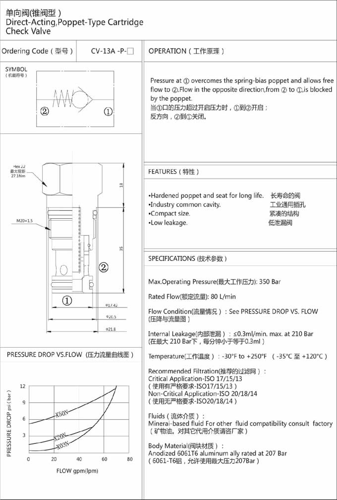 詳細信息 CV-13A-P-03,CV-13A-P-10,CV-13A-P-20,CV-13A-P-35,CV-13A-P-50,單向閥