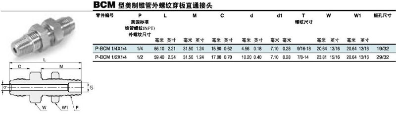 詳細(xì)信息 P-BCM-1/4*1/4,P-BCM-1/2*1/4,錐管外螺紋穿板直通接頭