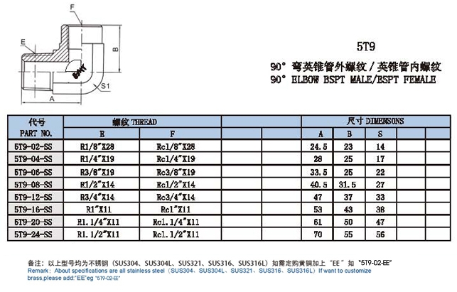 5T9-02-SS,5T9-04-SS,5T9-06-SS,5T9-08-SS,5T9-12-SS,5T9-24-SS,直角內(nèi)外絲接頭
