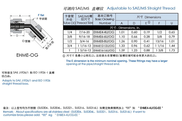 詳細(xì)信息 EHME4-4U/OG,EHME6-6U/OG,EHME8-8U/OG,EHME12-12U/OG,EHME16-16U/OG,45°可調(diào)向卡套接頭