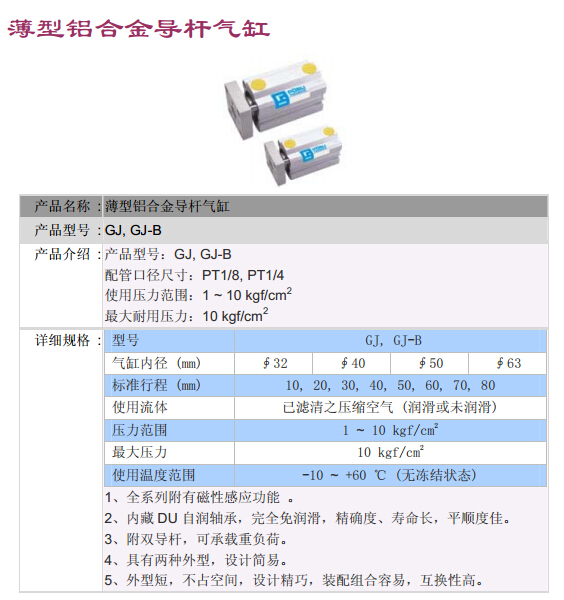 GJ-32*10,GJ-40*10,GJ-50*10,GJ-63*10,GJ-B-32*10,GJ-B-40*10,GJ-B-50*10,GJ-B-63*10,POSU薄型鋁合金導桿氣缸 |