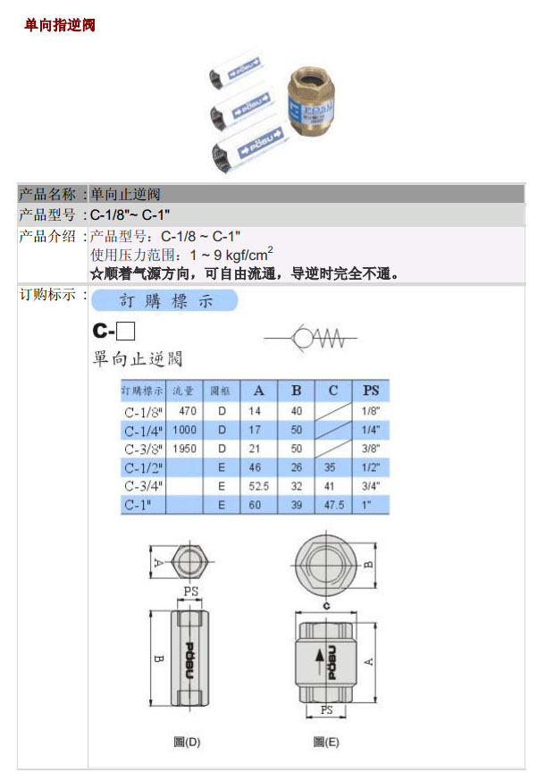 C-1/8",C-1/4",C-3/8",C-1/2",C-3/4",C-1",POSU單向止逆閥