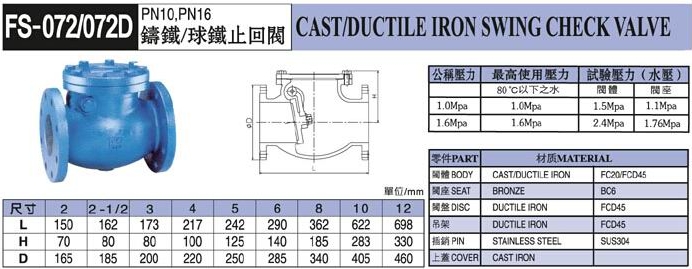 FS072鑄鐵橫式止回閥由閥體、閥蓋及橡膠瓣三種主要零件組成。其中橡膠瓣由鋼板、鋼棒及強(qiáng)化尼龍布作襯底,外層披覆橡膠制成,閥瓣開關(guān)壽命可達(dá)100萬次,該閥采用全流面積式設(shè)計(jì),具有水頭損失小,不易堆積雜物,維修簡單。該閥主要適用于給排水系統(tǒng),可安裝于水泵出水口處,以防止倒流及水錘對泵損害。該閥還可安裝在蓄水池進(jìn)出水管的旁通管上,以防止池水倒流至給水系統(tǒng)中。