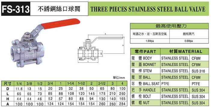 | 閥桿STEM | STAINLESS STEEL | SUS 316 |