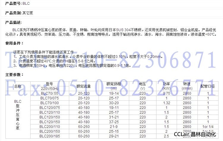 220V/50Hz,BLC70/.55,BLC70/075,BLC70/100,不銹鋼沖壓離心泵