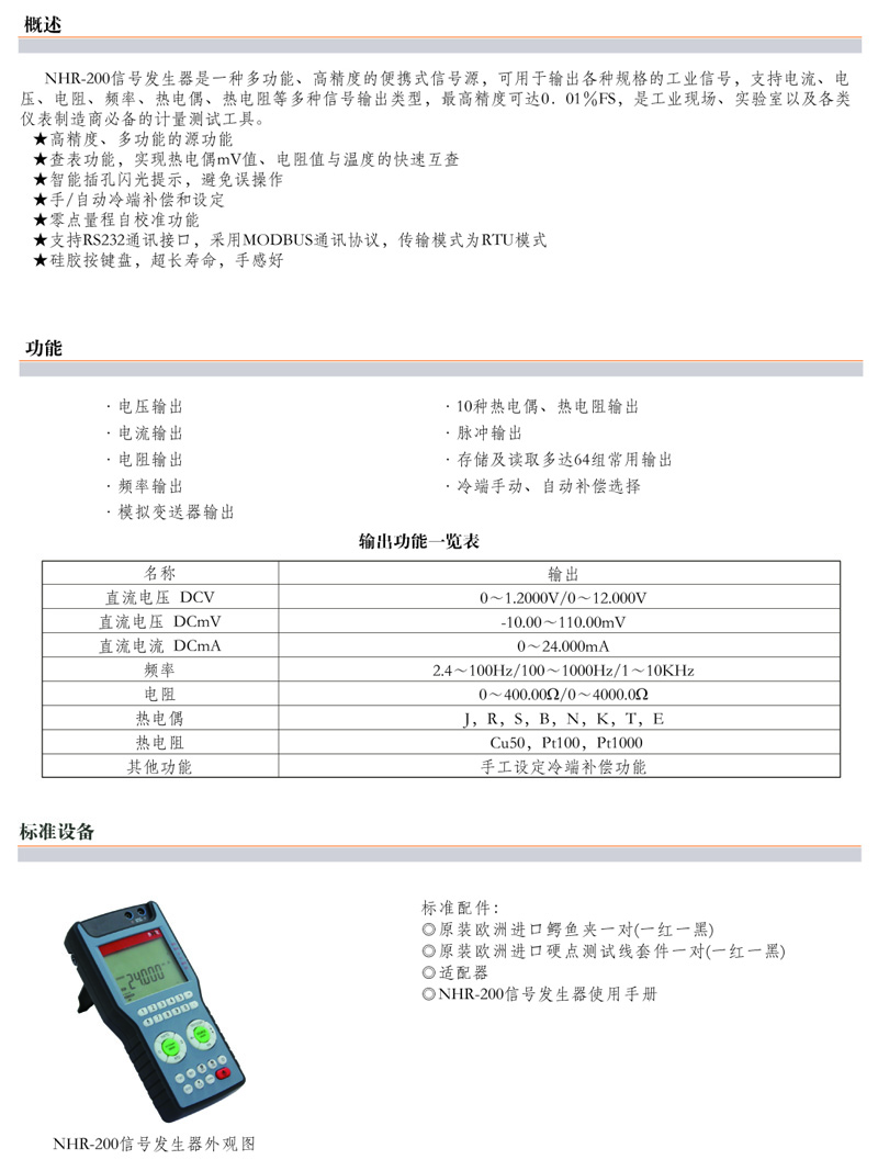 詳細信息 NHR-200信號發(fā)生器是一種多功能、高精度的便攜式信號源,可用于輸出各種規(guī)格的工業(yè)信號,支持電流、電壓、電阻、頻率、熱電偶、熱電阻等多種信號輸出類型,最高精度可達0.01%F.S,是工業(yè)現(xiàn)場、實驗室以及各類儀表制造商必備的計量測試工具。