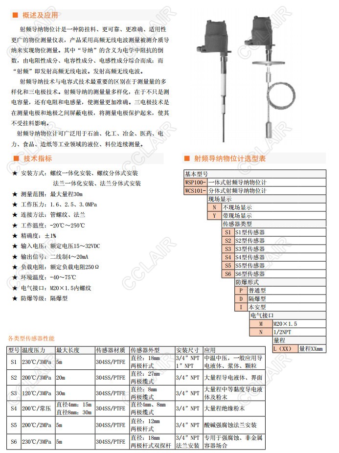 型號: WSP100-NS1PM,WSP100-NS3PM,WCS101-NS2DN,WCS101-YS6IN,射頻導納物位計