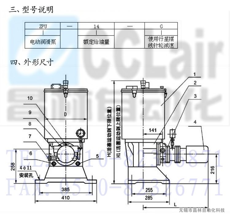 | 1、貯油筒;2、泵座;3、帶連結(jié)法蘭的柱塞泵裝置;4、減速電機(jī)5、加油口G3/4; 6、回油口G3/4;7、調(diào)壓安全閥;8、出油口G3/4;9、過(guò)濾器;10、單向閥 |
