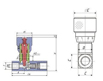 | 貨號(hào) | 尺寸 | 通徑 | Ls | A | C | D | ФE | H | H1 | H2 | 最大流量 | 最大工作壓力 | 螺紋 |