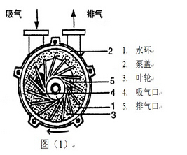 如圖(1)所示2BV水環(huán)真空泵葉輪3偏心地安裝在泵體之內(nèi),起動時(shí)向泵內(nèi)注入一定高度的水,因此當(dāng)葉輪3旋轉(zhuǎn)時(shí),水受離心力的作用而在泵體內(nèi)壁形成一旋轉(zhuǎn)水環(huán)1,水環(huán)下部內(nèi)表面與輪轂相切,沿箭頭方向旋轉(zhuǎn),在前半轉(zhuǎn)過程中,水環(huán)內(nèi)表面逐漸與輪轂脫離,因此在葉輪葉片間功與水環(huán)形成封閉空間,隨著葉輪的旋轉(zhuǎn),該空間逐漸擴(kuò)大,空間氣體壓力降低,氣體自圓盤吸氣被吸入;在后半轉(zhuǎn)過程中,水環(huán)內(nèi)表面逐漸與輪轂靠近,葉片空間逐漸縮小,空間氣體壓力升高,高于排氣口壓力時(shí),葉片間的氣體自圓盤排氣口被排出。如此葉輪每轉(zhuǎn)動一周,葉片間的空間吸排氣一次,許多空間不停地工作,2BV水環(huán)式真空泵就連續(xù)不斷地抽吸或壓送氣體。
