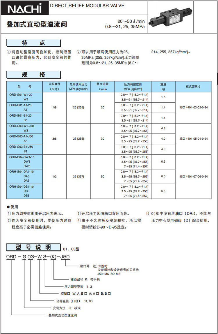 ORD-G01,ORD-G03,ORH-G04,ORD-G01-W1-20,ORD-G03-W1-J50,ORH-G04-DW1-10,NACHI疊加式直動(dòng)型溢流閥