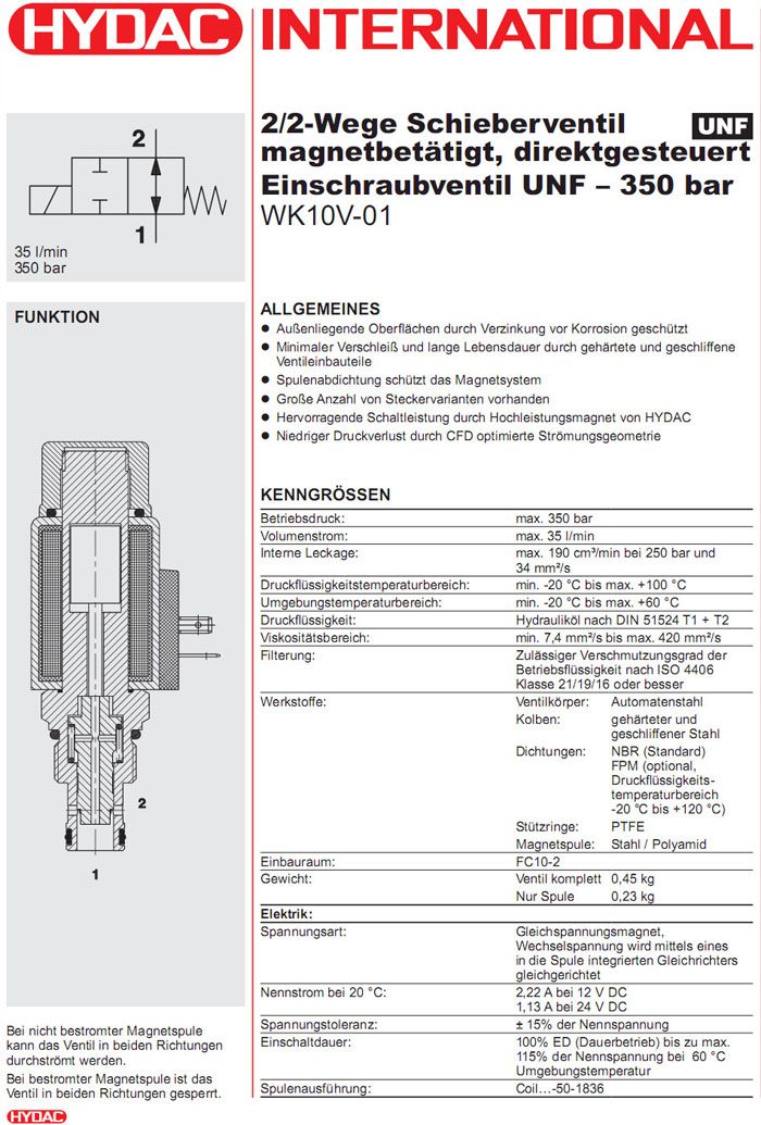 WK10V-01-C-N-24DG,WK10V-01-C-N-230AG,HYDAC電磁2/2方向滑閥