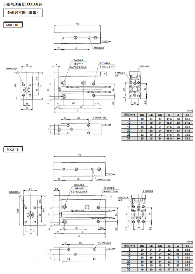 MXU6-5,MXU10-5,MXU16-5,MXU6-10,MXU10-10,MXU16-10,MXU6-15,MXU10-15,SMC小型氣動滑臺氣缸