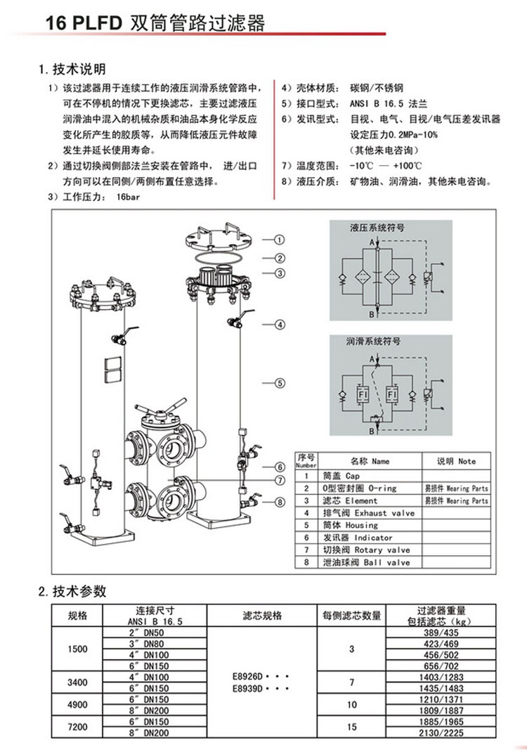 16PLFD15,16PLFD34,16PLFD49,16PLFD72,16PLFD15S2602KN3,16PLFD34S2604KN3,16PLFD72S2606KN3,雙筒管路過濾器