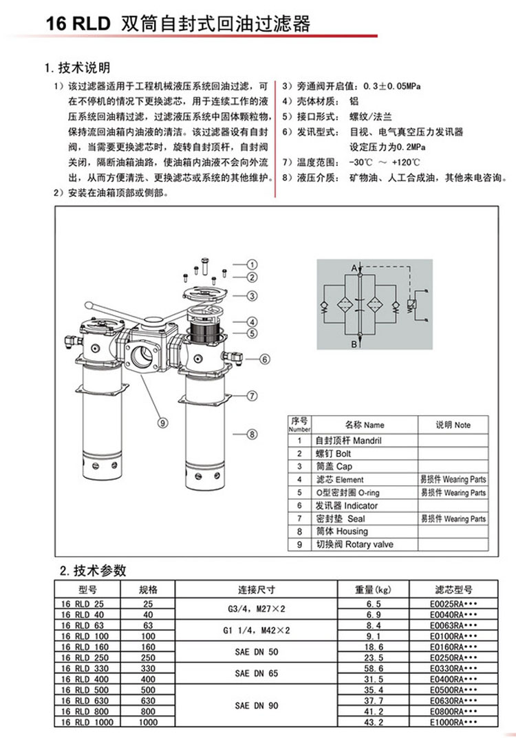 16RLD330,16RLD400,16RLD500,16RLD630,16RLD800,16RLD1000,16RLD330MKN5ABP,雙筒自封式回油過濾器 |