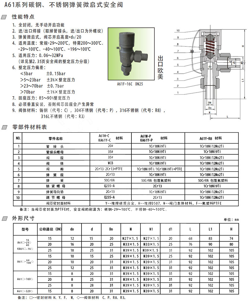 A61H-16C,KA61Y-16C,A61W-64P,KA61Y-64P,A61Y-160R8,微啟式安全閥