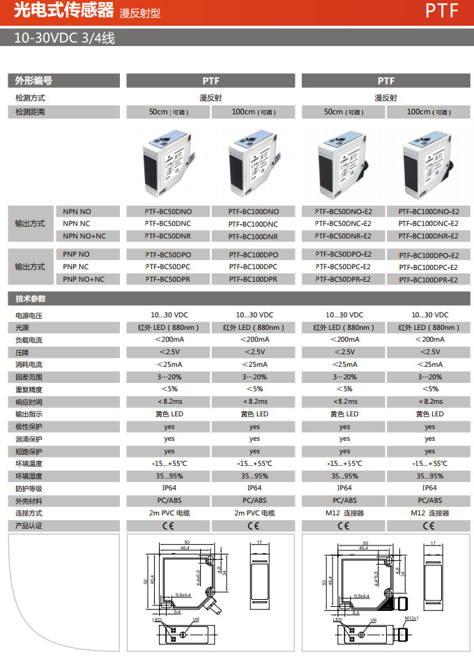PTF-BC50DNO,PTF-BC50DNC,PTF-BC50DNR,PTF-BC50DPO,PTF-BC50DPC,PTF-BC50DPR,PTF-BC100DNO,光電式傳感器 |