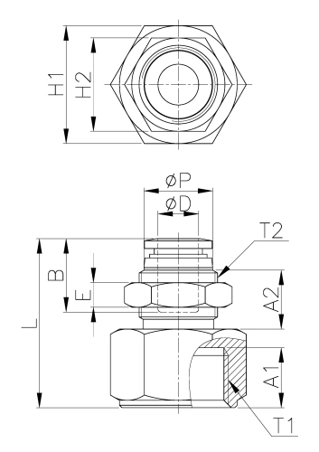 | Model | ∅D | ∅P | T1 | T2 | L | E | A1 | A2 | B | H1(Hex) | H2(Hex) | ORIFICE | WEIGHT(g) | EA(BOX) |