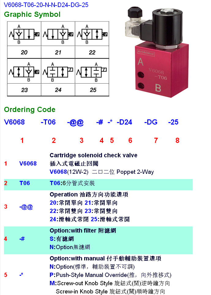 V6068-T06-21,V6068-T06-22,V6068-T06-23,V6068-T06-24,V6068-T06-20-N-N-D24-DG-25,HYDROMAX插入式電磁止回閥 |