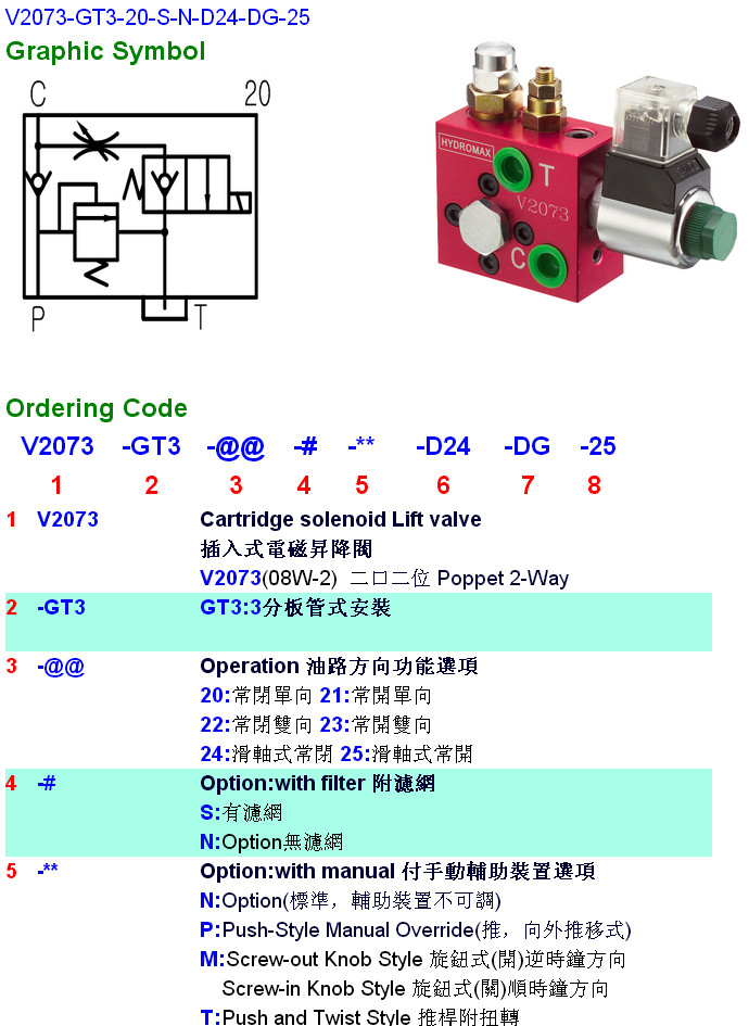 V2073-GT3-21,V2073-GT3-22,V2073-GT3-23,V2073-GT3-24,V2073-GT3-20-S-N-D24-DG-25,HYDROMAX插入式電磁升降閥 |