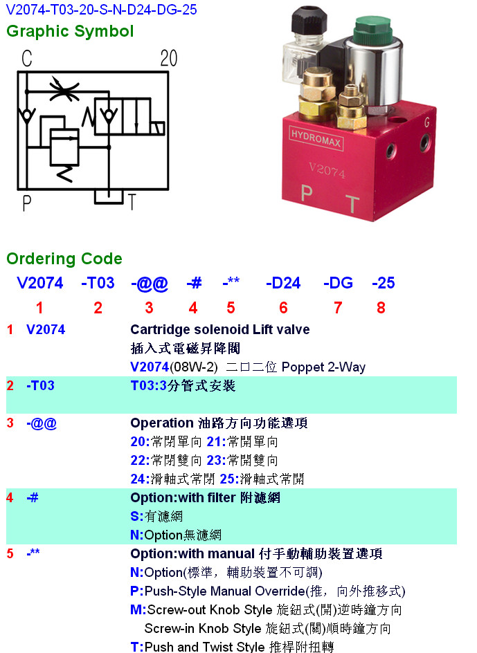 V2074-T03-21,V2074-T03-22,V2074-T03-23,V2074-T03-24,V2074-T03-20-S-N-D24-DG-25,HYDROMAX插入式電磁升降閥 |