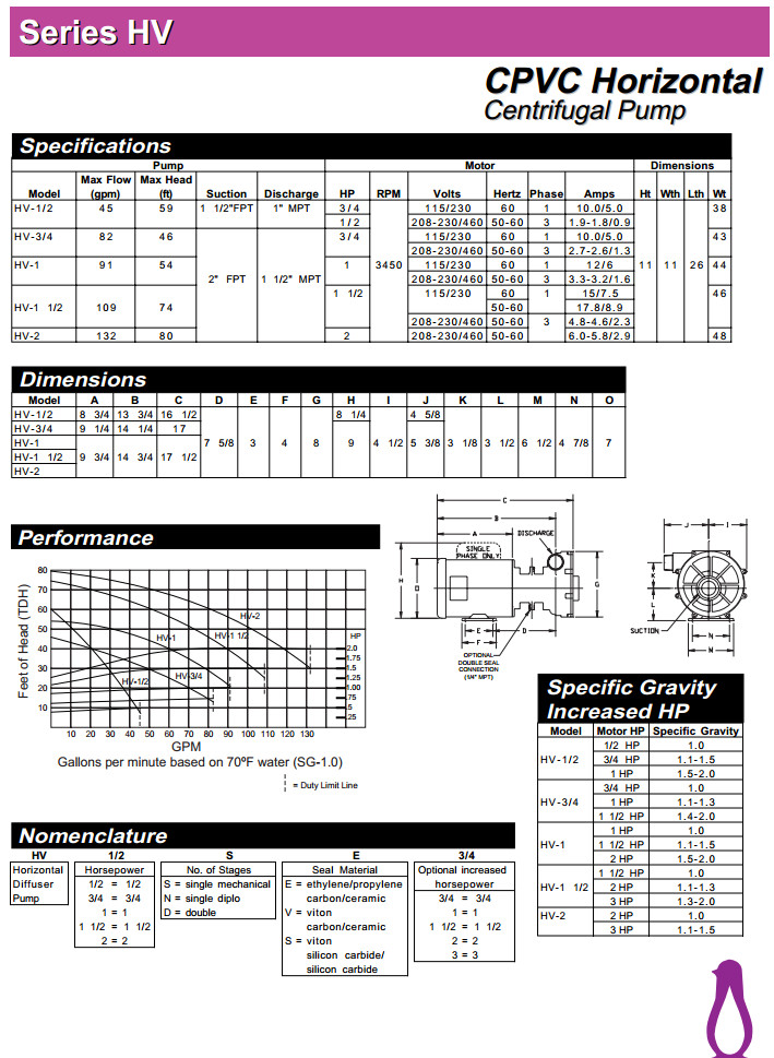 HV-1/2,HV-3/4,HV-1 N,HV-1 1/2,HV-2,PENGUIN臥式離心泵