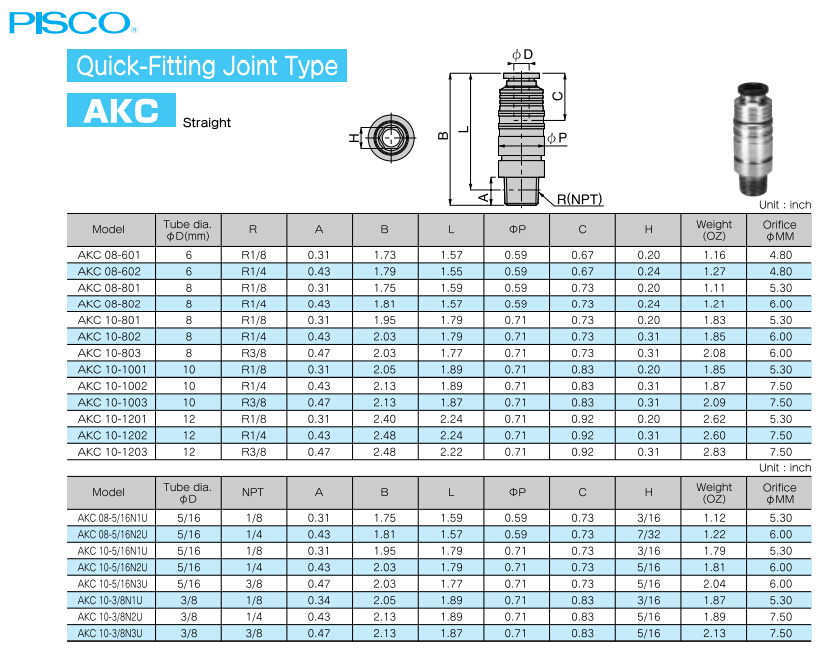 AKC08-601,AKC10-801,AKC10-1001,AKC08-5/16N1U,AKC10-5/16N1U,AKC10-3/8N1U,AKC08-802,PISCO耐熱管接頭 |